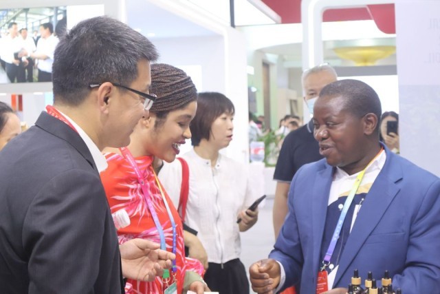 6月13日,在第四届中国—非洲经贸博览会,来自布隆迪的阿尔弗雷德·布里马索(右一)向客户推介展品。新华社记者周昊瑾摄